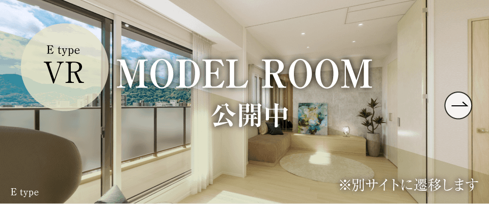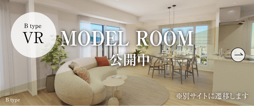 ※B・EタイプVRモデルルームに掲載の家具調度品は販売価格に含まれておりません。また、居室内からの眺望はBタイプ:現地13階相当(約37m)、Eタイプ:現地12階相当(約34m)の高さから撮影した写真(2024年9月撮影)を合成したもので実際の住戸からの眺望とは異なります。尚、将来にわたって眺望条件が変わらないことを保証するものではございません。