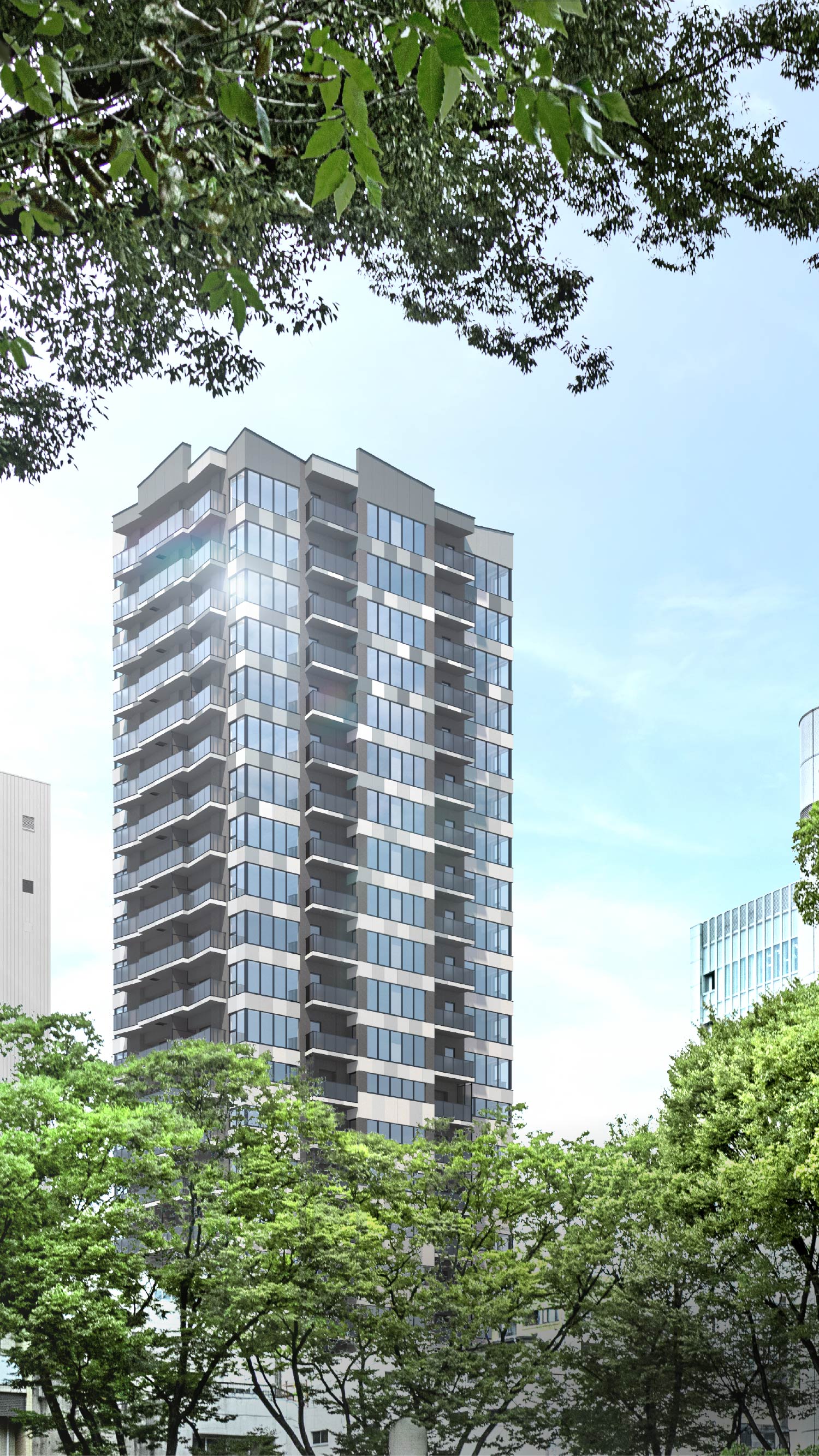 ※掲載の外観完成予想CG(2)は、現地周辺(現地より約50m、高さ約58m)から北東方面を撮影した眺望写真(2025年11月)を合成したものです。計画段階の図面を基に描き起こしたもので形状・色等は実際とは異なります。なお、外観形状の細部、設備機器等は表現しておりません。眺望・景観は各階・各住戸により異なり、今後の周辺環境の変化に伴い将来にわたって保証されるものではありません。また、家具・調度品は販売価格に含まれません。