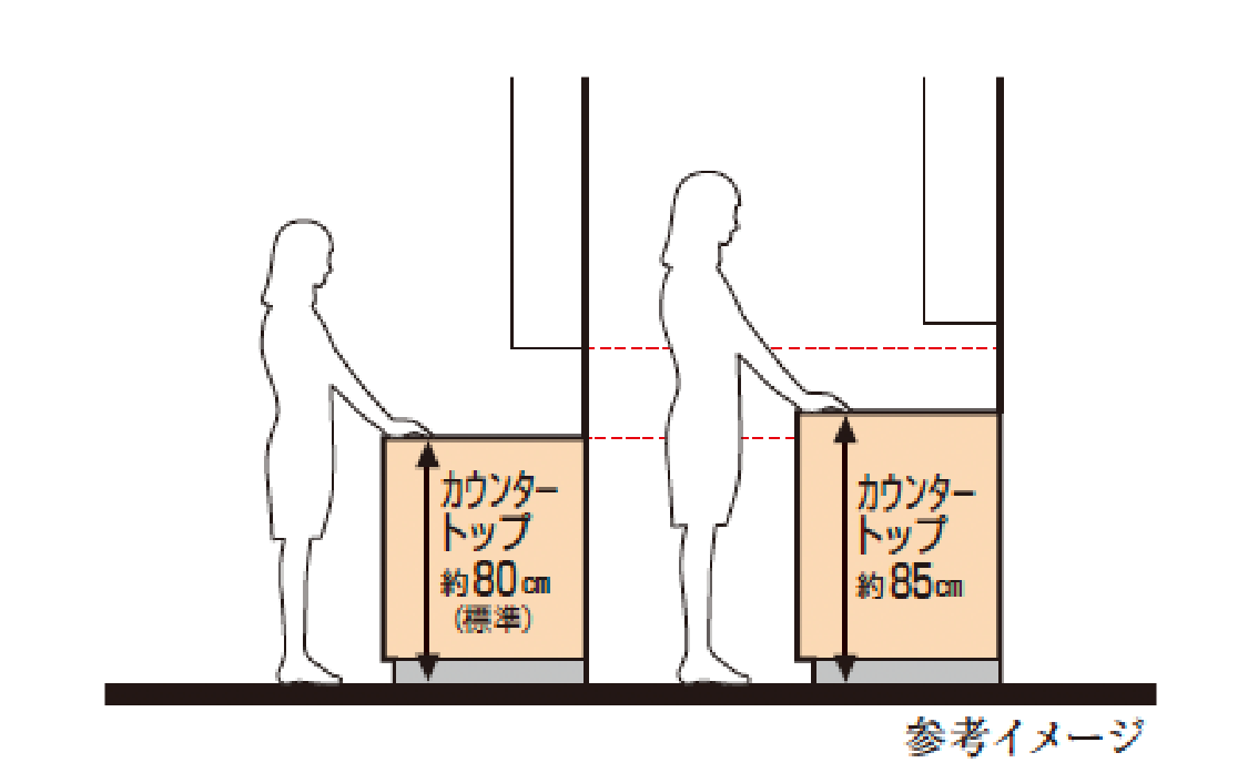 カウンタートップの高さを約80㎝(標準)・約85㎝より