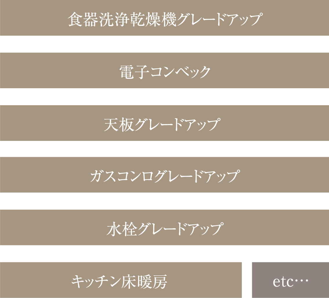※St-56A、S-70B、St-50C、S-71D、St-58E、S-63F、S-89G、S-89H、S-66I、S-90G、S-90Hは、リンナイ製の食器洗浄乾燥機が、P-91J、P-117K、P-100L、L-155M、L-161Nはミーレ社製の食器洗浄乾燥機が標準設置されています。