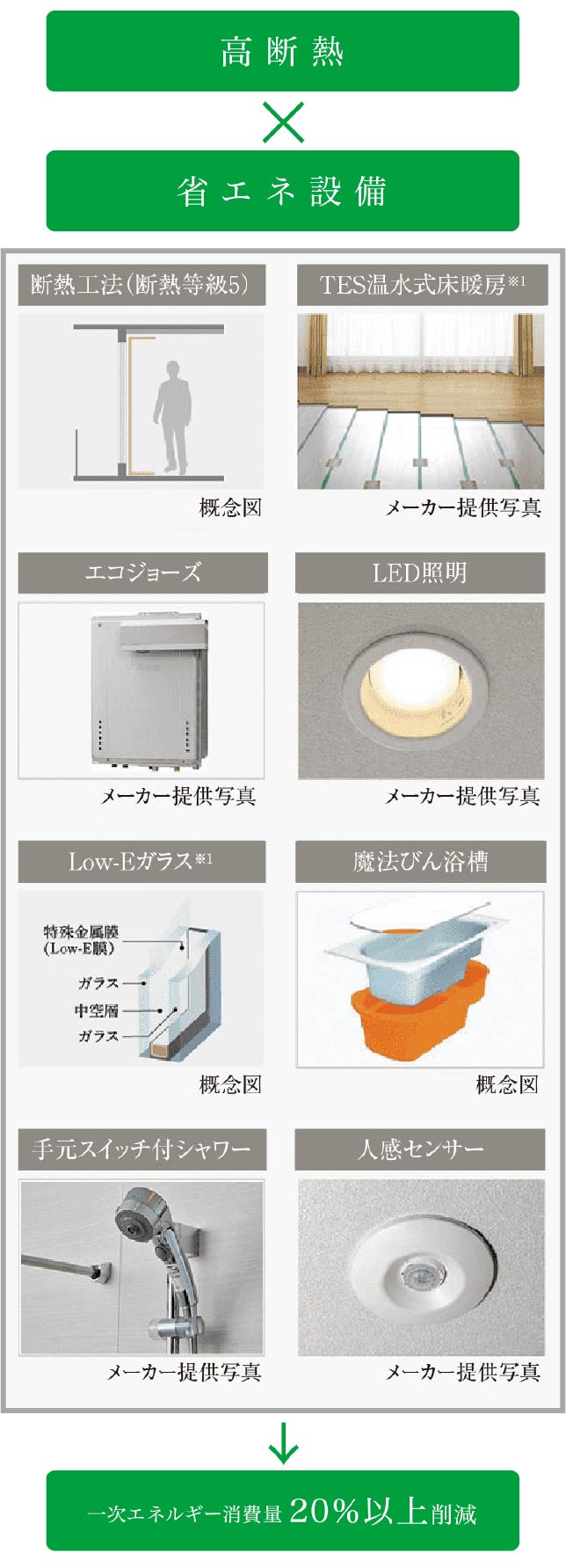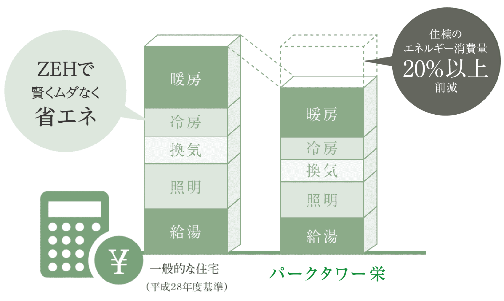 共用部を含むマンション全体での一次エネルギー消費量を20%以上削減※したマンションです。