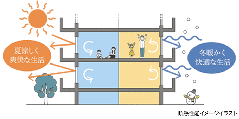 ZEHマンションは、住戸内の温度が外部の温度変化の影響を受けにくいため、夏の暑さも冬の寒さも住戸内に伝わりにくく、部屋間の温度差も減少。エアコンで快適に調整した住戸内の温度が長く安定して保たれるため、年間を通して快適で健やかにお過ごしいただけます。
