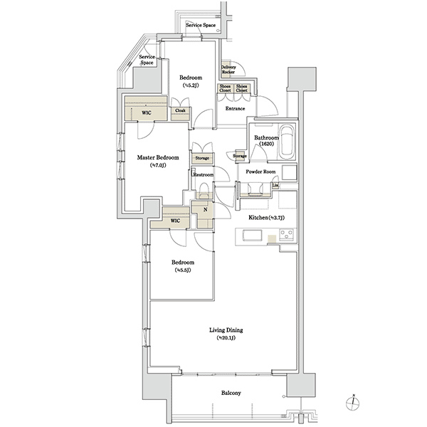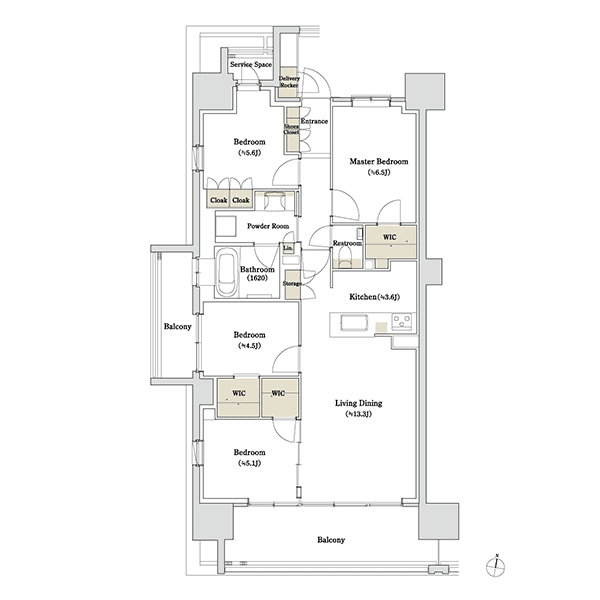 サービススペース面積/1.60㎡(SAタイプ)・4.65㎡(NDタイプ)・5.16㎡(SIタイプ)・5.22㎡(SKタイプ)、専用宅配ロッカー面積/0.22㎡(3戸)~0.65㎡(2戸)