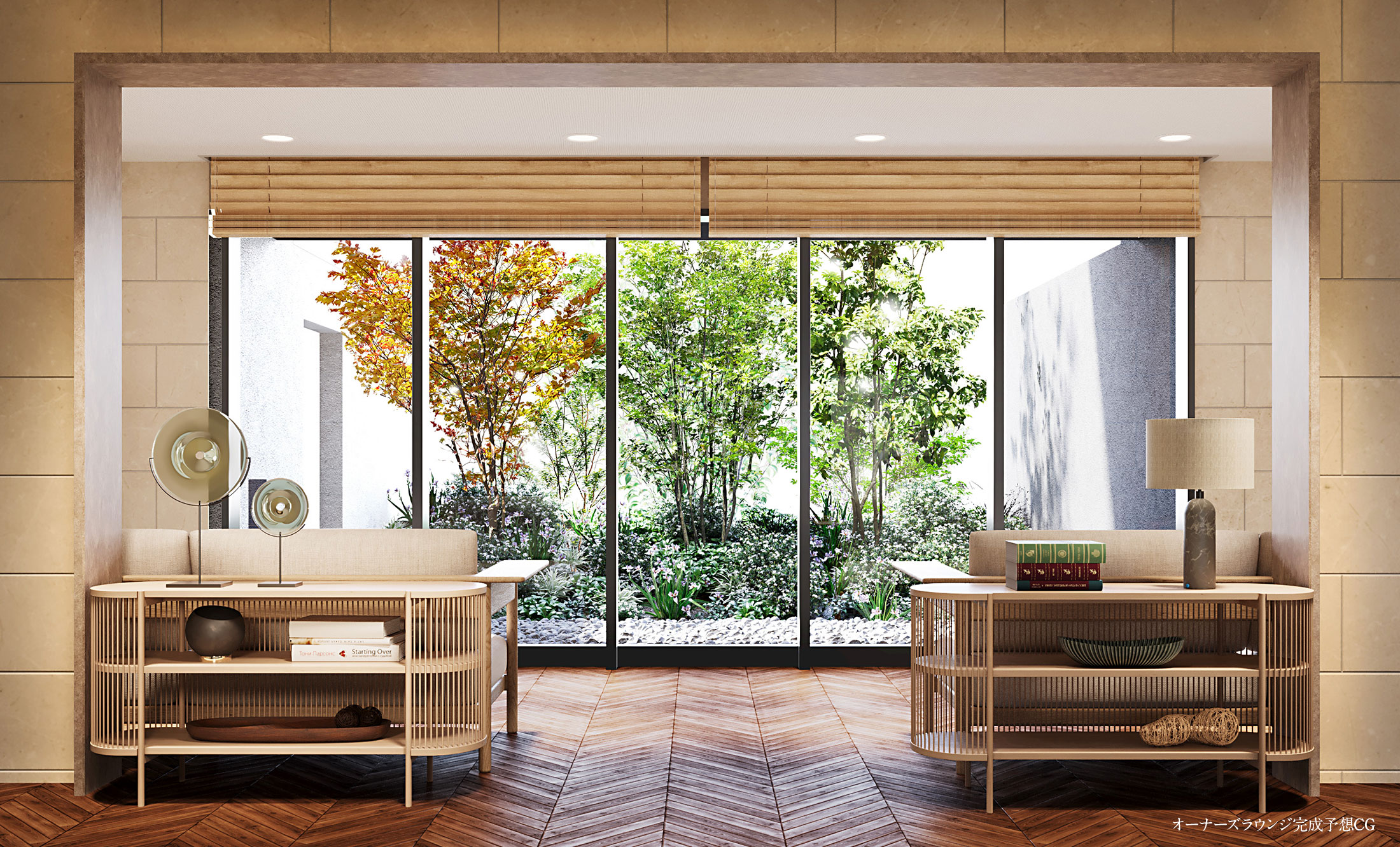 ※掲載のオーナーズラウンジ完成予想CGは計画段階の図面を基に描き起こしたもので、形状・色等は実際とは異なります。なお、形状の細部、設備機器等は表現しておりません。※表現されている植栽は初期の生育期間を経た状態のものを想定して描いており、竣工時は植物の生育を見込んで必要な間隔をとって植えております。施工上の都合により、設定位置・植高・本数等変更となる場合があります。また、施工上の都合、行政官庁の指導等により変更が生じる場合がございます。※共用部分の使用については管理規約等に従っていただきます。共用部の家具・調度品・アート作品等は変更となる場合がございます。