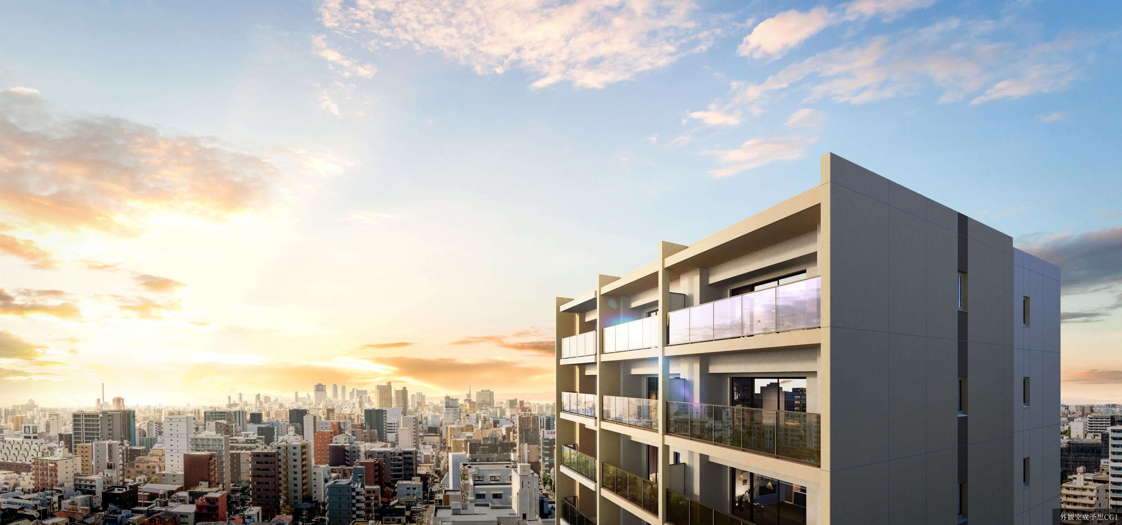 ※掲載の外観完成予想CG1は、計画段階の図⾯を基に描き起こしたもので、形状・⾊等は実際とは異なります。現地15 階相当の⾼さ(約45m)から⻄⽅⾯を撮影(2023年7⽉)した眺望写真にCGを合成したものです。実際の住⼾からの眺望とは異なります。眺望・景観は、各階・各住⼾により異なり、今後の周辺環境の変化に伴い将来にわたって保証されるものではありません。なお、形状の細部、設備機器等は表現しておりません。また家具・照明・調度品等は販売価格に含まれておりません。また、施⼯上の都合、⾏政官庁の指導等により変更が⽣じる場合がございます。