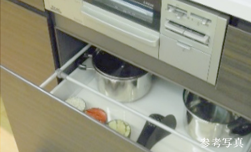 コンロ下のキャビネットは大きいお鍋や調理器具を収納できる大容量タイプです。