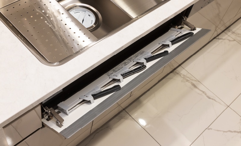 シンク手前のデッドスペースを有効活用した包丁差しです。ソフトオープンやチャイルドロック機能もあるので安心です。