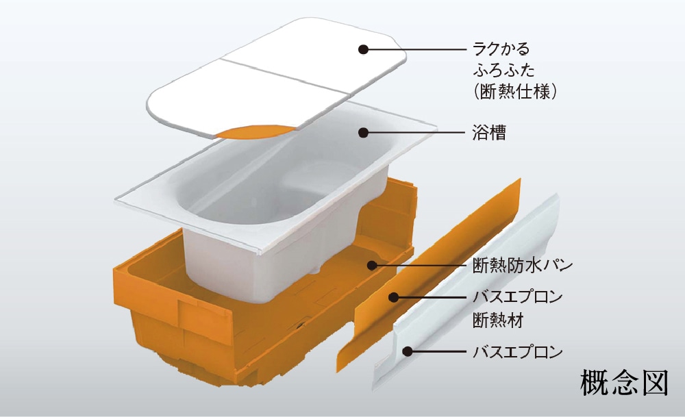 浴槽に断熱材を覆い追い炊き無しでもすぐに入浴できるほど保温性の高い浴槽です。