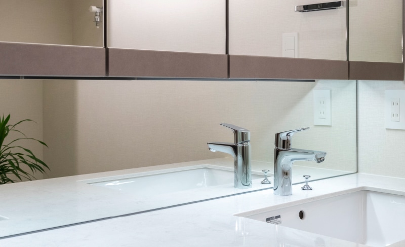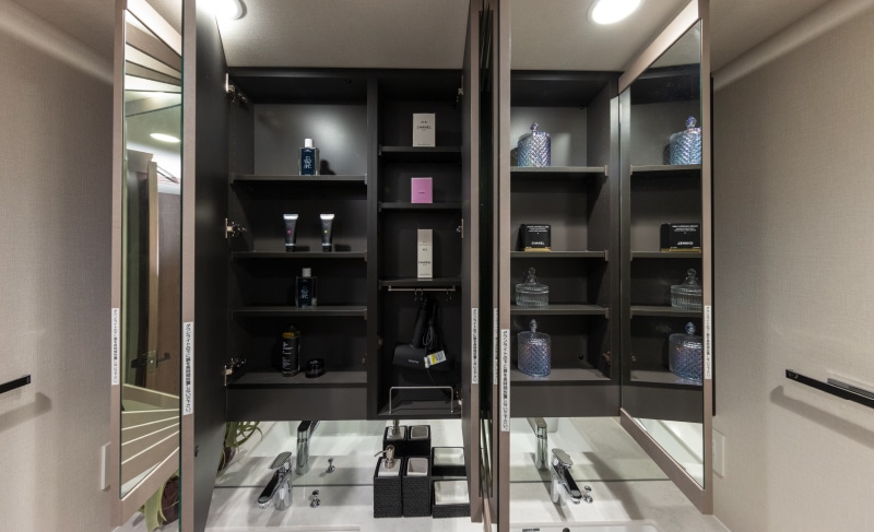 空間をより広く見せれる三面鏡下にもミラーを設置。お手入れもラクラクです。