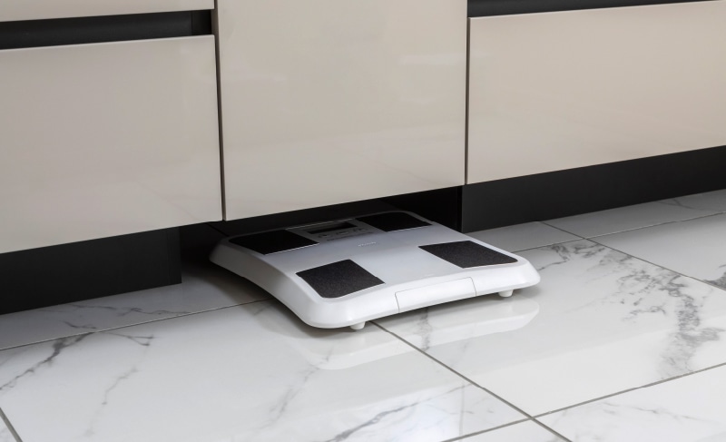 洗面化粧台の巾木部分を有効活用。ヘルスメーターが収まるスペースを確保しています。