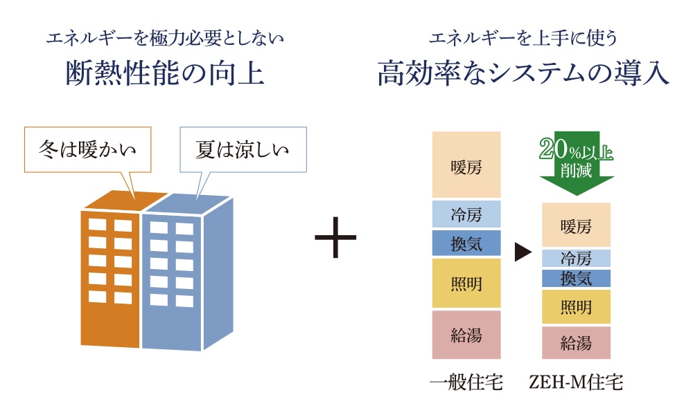 ZEH-M Orientedとは、断熱性能を向上させるとともに、高効率な設備システムの導入により、室内環境の質を維持しつつ大幅な省エネを実現し、共用部を含むマンション全体での一次エネルギー消費量を20%以上削減※1したマンションです。
