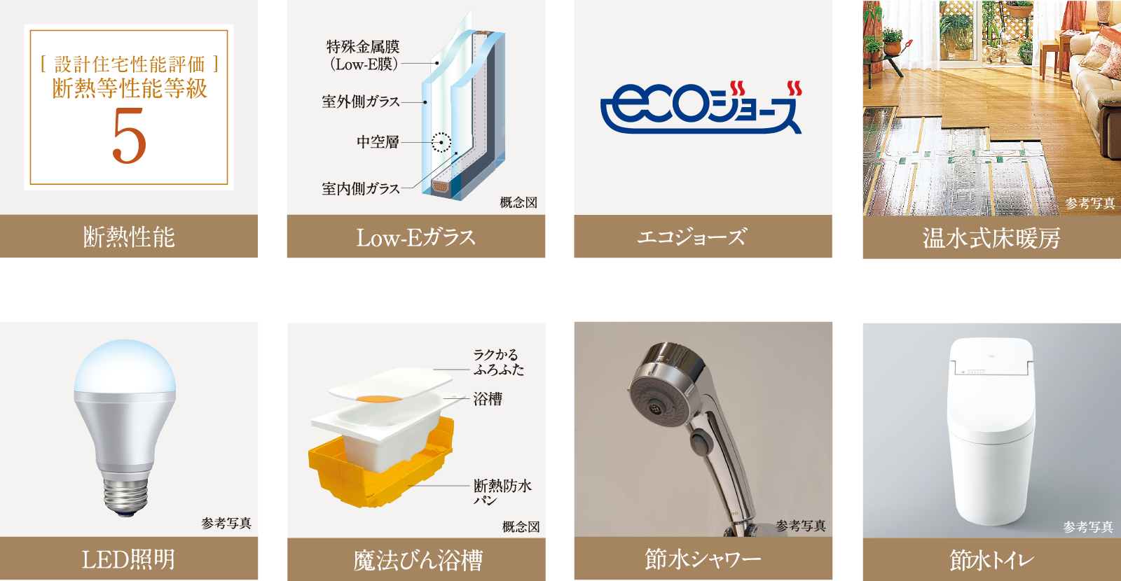 ※掲載の内容は、計画段階のものであり、今後施工上・製品の廃盤等の都合上変更となる場合がございます。※掲載の写真は、本物件と同等の設備仕様を撮影した施工例です。プランタイプやカラーセレクトにより仕様、形状等が異なるものや一部オプション(無償・有償含む)が含まれております。また、参考写真にてご説明しているものもある為、実際の色味・形状と異なる場合がございます。
