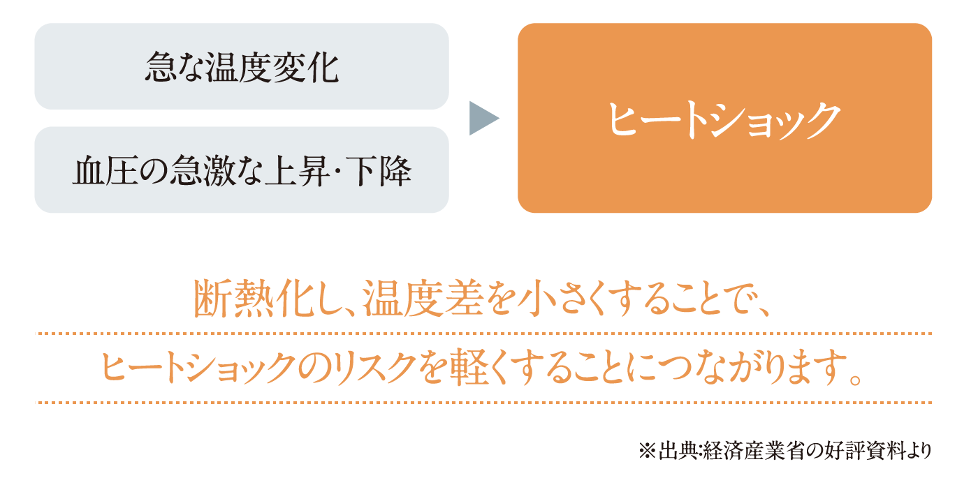 暖かい家にはヒートショックのリスクを軽減する効果や起床時の血圧上昇を抑える効果などがあると言われています。逆に断熱性能の低い住宅は、冬の暖房時の部屋間の温度差が大きく、ヒートショックのリスクが高いと言われています。