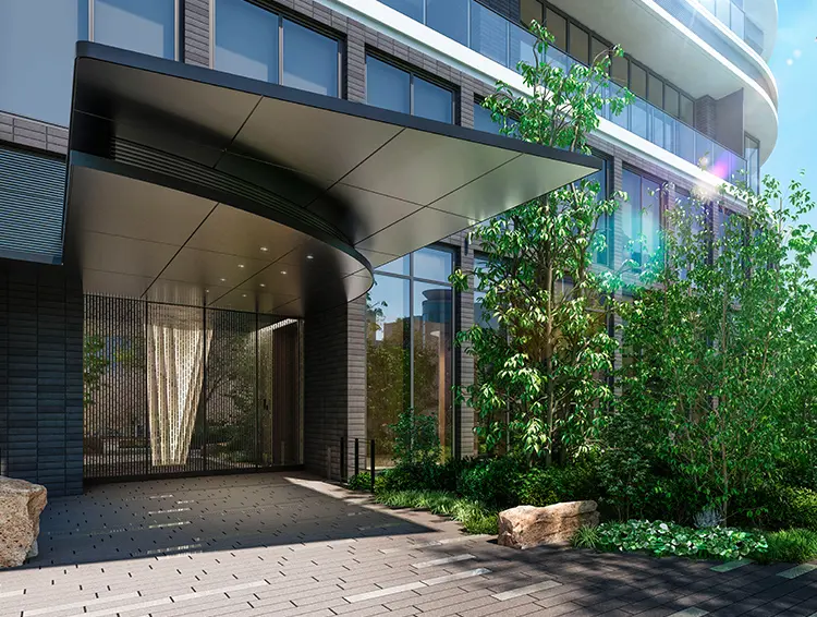 ※各完成予想CGは、計画段階の図面を基に描き起こしたもので、形状・色等は実際とは異なります。施工上の都合、行政官庁の指導等により変更が生じる場合がございます。なお、形状の細部、設備機器等は表現しておりません。表現されている植栽は初期の生育期間を経た状態のものを想定して描いており、竣工時は植物の生育を見込んで必要な間隔をとって植えております。