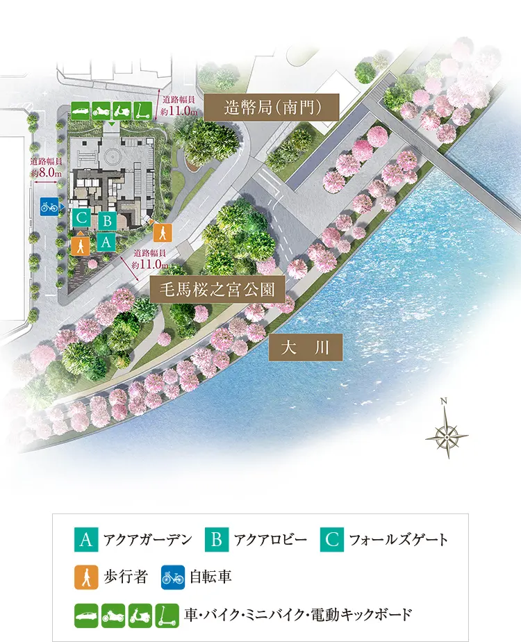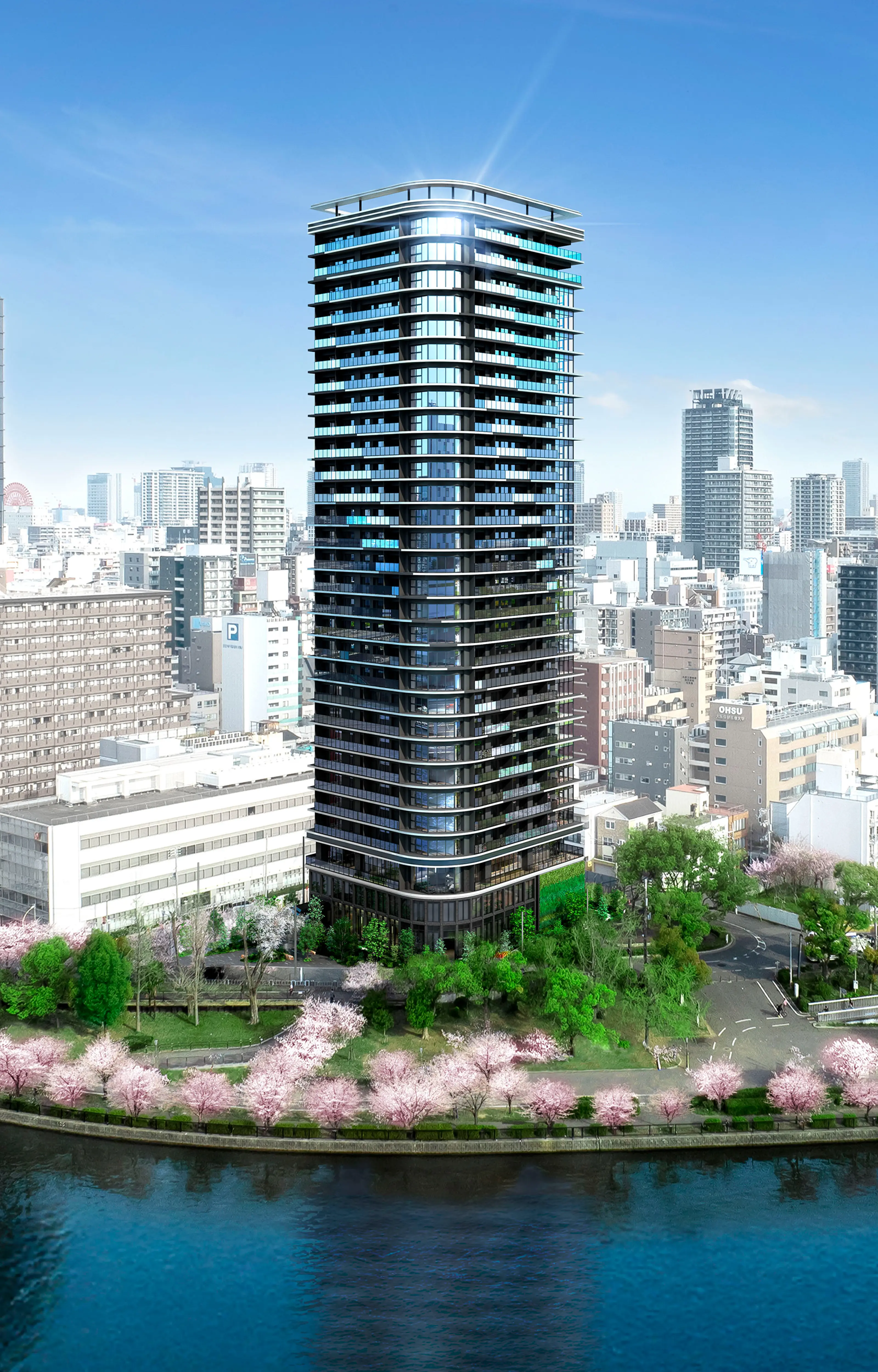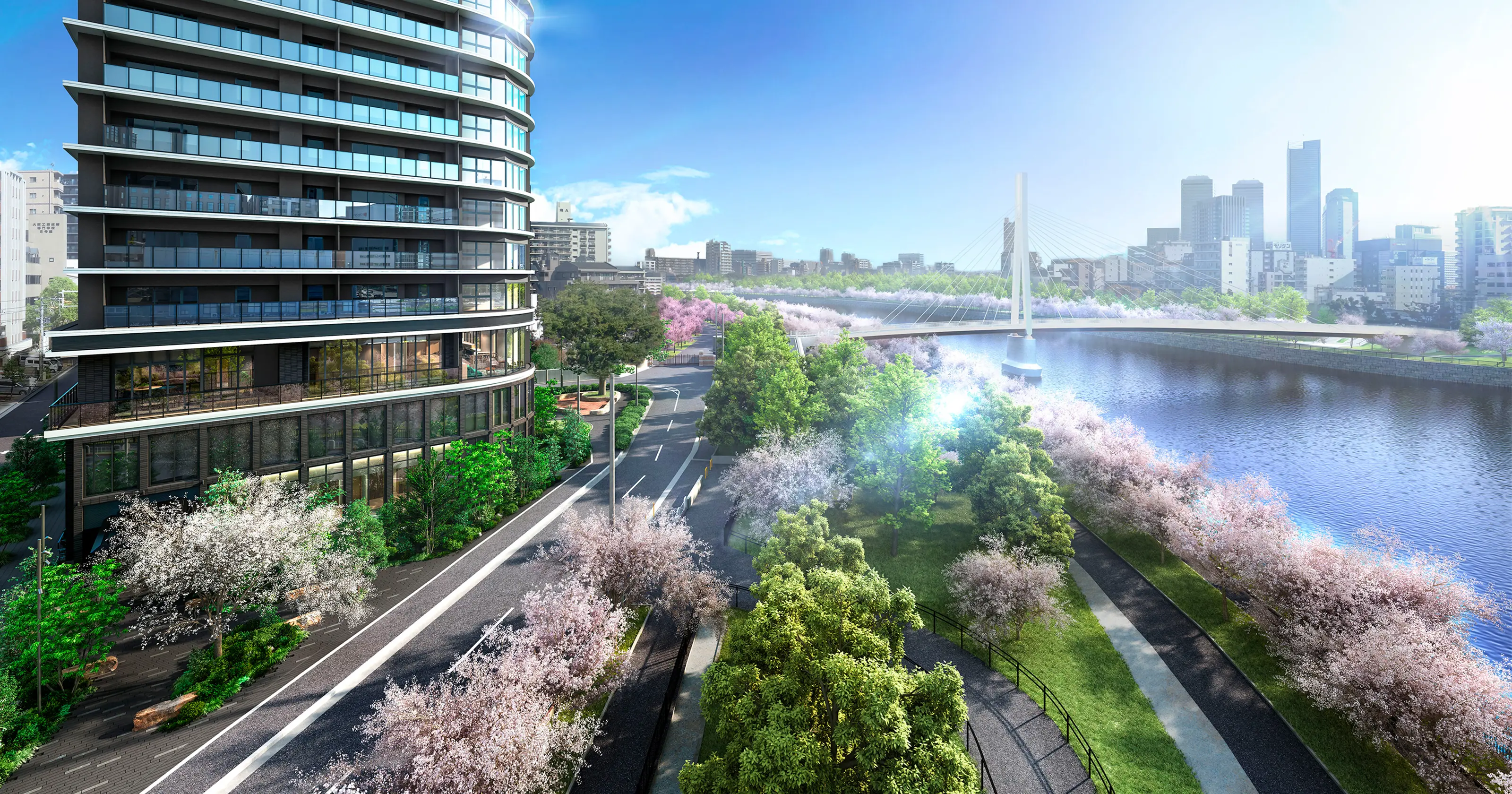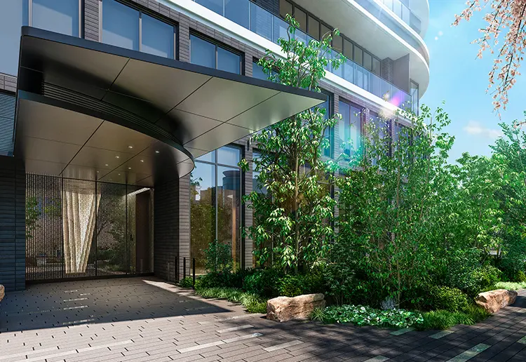 ※各完成予想CG・現地周辺イラストは、計画段階の図面を基に描き起こしたもので、形状・色等は実際とは異なります。施工上の都合、行政官庁の指導等により変更が生じる場合がございます。なお、形状の細部、設備機器等は表現しておりません。表現されている植栽は初期の生育期間を経た状態のものを想定して描いており、竣工時は植物の生育を見込んで必要な間隔をとって植えております。