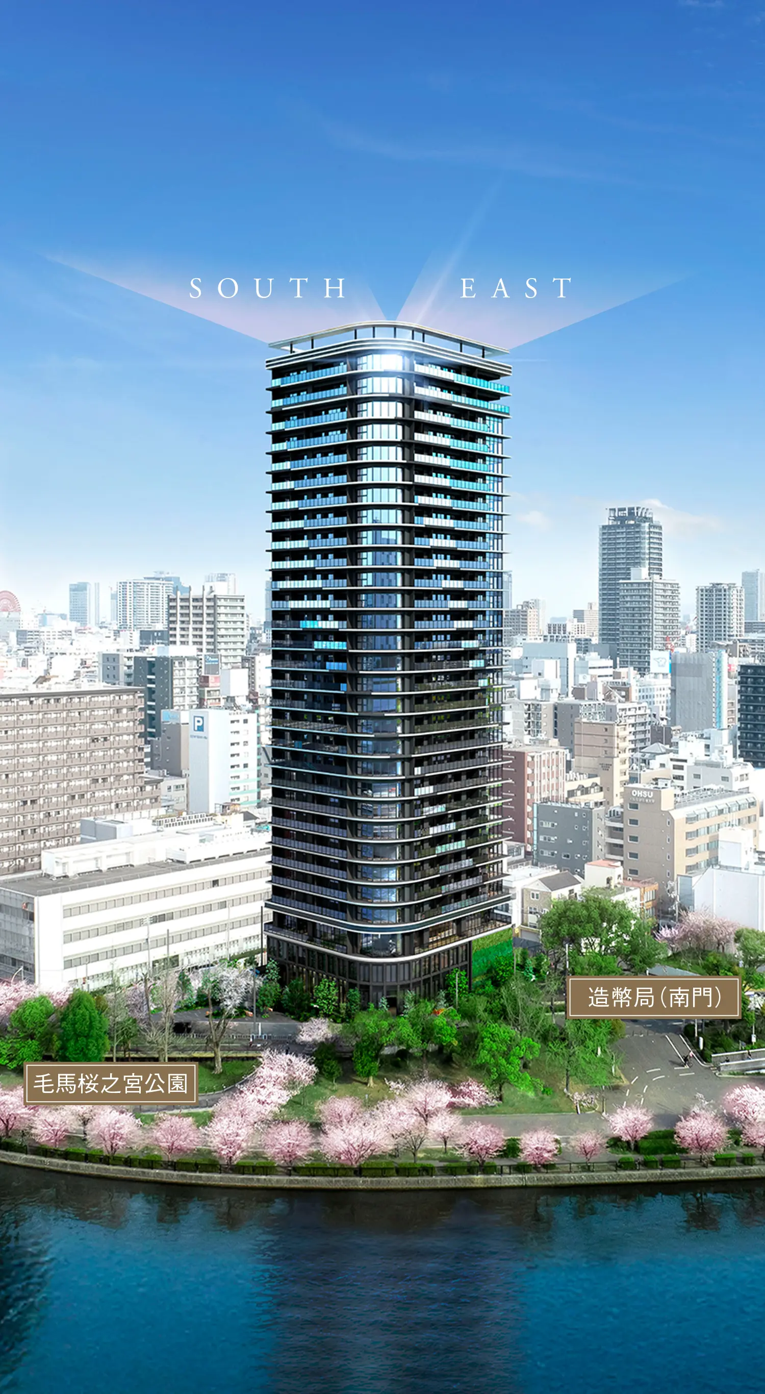 造幣局(徒歩1分/約80m)※掲載の各完成予想CG・現地周辺イラストは、計画段階の図面を基に描き起こしたもので、形状・色等は実際とは異なります。なお、形状の細部、設備機器等は表現しておりません。表現されている植栽は初期の生育期間を経た状態のものを想定して描いており、竣工時は植物の生育を見込んで必要な間隔をとって植えております。施工上の都合、行政官庁の指導等により変更が生じる場合がございます。※共用部の家具・調度品・照明等は変更となる場合がございます。