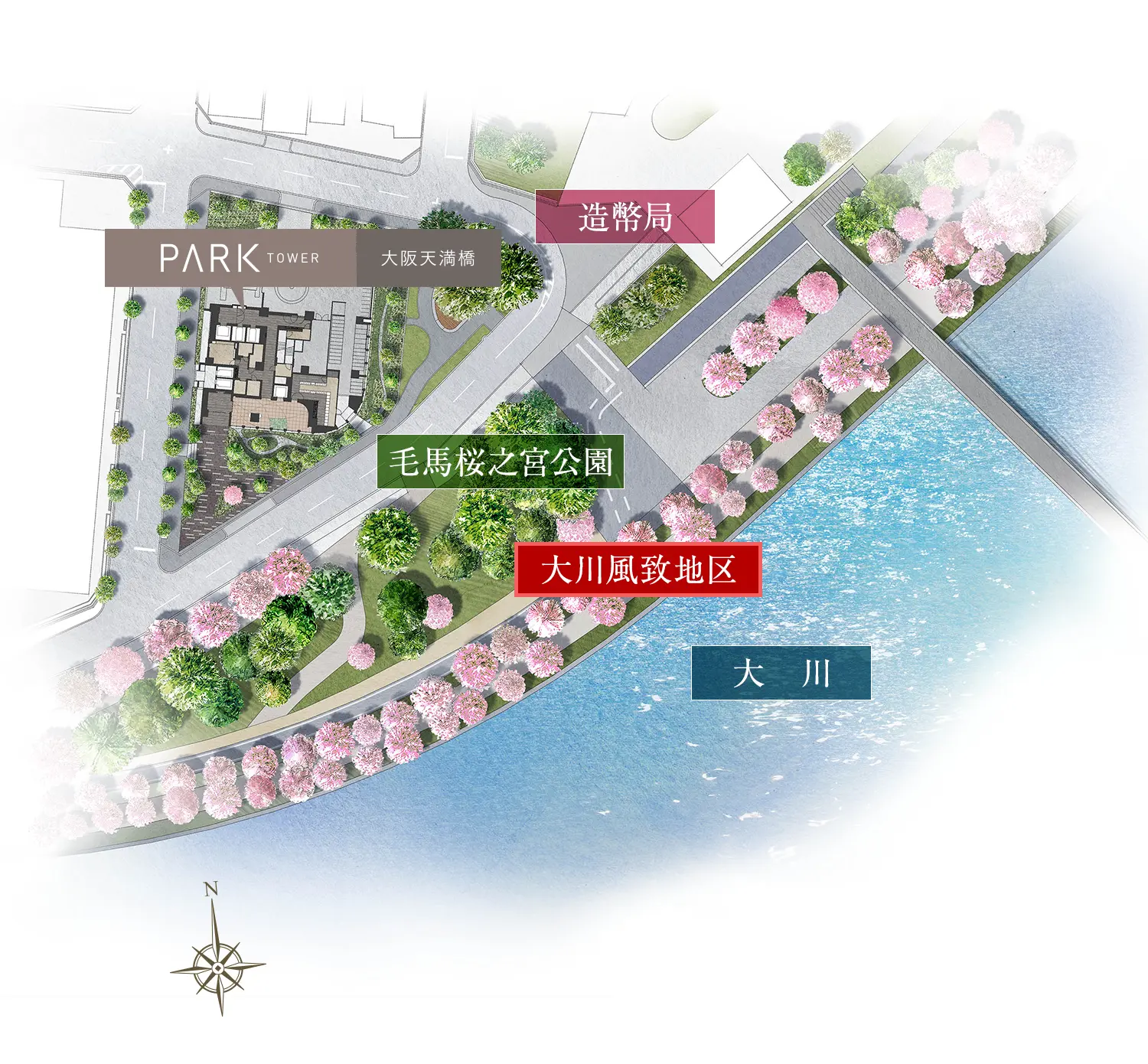 現地は、良好な住環境と都市としての利便性にも配慮された、大阪市北区では数少ない住居系地域「第二種住居地域」に指定されています。同時に、良好な自然環境を保持する「大川風致地区」に隣接。東京ドームの約37倍の面積となる約177.7haの広さを誇る、北区で唯一の風致地区内には、緑豊かな自然環境や多くの文化財とともに、趣深い景色が広がっています。