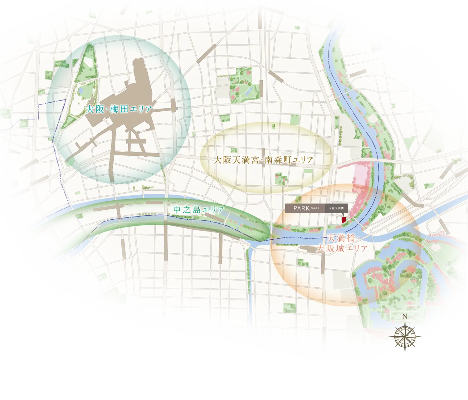 Osaka Metro谷町線駅「天満橋」駅からは、最先端のトレンドが集まる大阪の中心「梅田エリア」まで直通5分。自然と芸術が調和する、美しきアイランドシティ「中之島エリア」も徒歩圏に。天満橋周辺には、華やかな都心の賑わいを身近にしながら、自然の息吹も感じられるバランスのいい住環境が整っています。