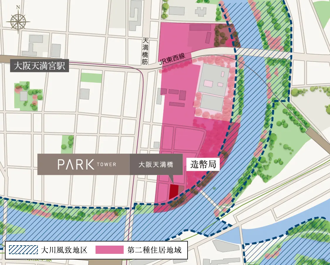 現地は、良好な住環境と都市としての利便性にも配慮された、大阪市北区では数少ない住居系地域「第二種住居地域」に指定されています。同時に、良好な自然環境を保持する「大川風致地区」に隣接。東京ドームの約37倍の面積となる約177.7haの広さを誇る、北区で唯一の風致地区内には、緑豊かな自然環境や多くの文化財とともに、趣深い景色が広がっています。
