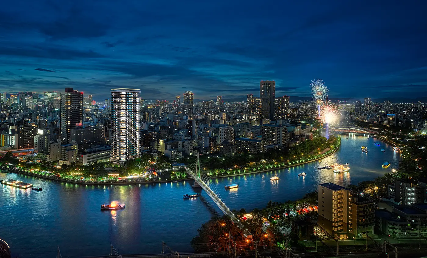 ※1.掲載の外観完成予想CGは、現地南東方向からの航空写真(2024年7月撮影)と天神祭奉納花火(2024年7月撮影)に完成予想CGを合成したもので、実際とは異なります。