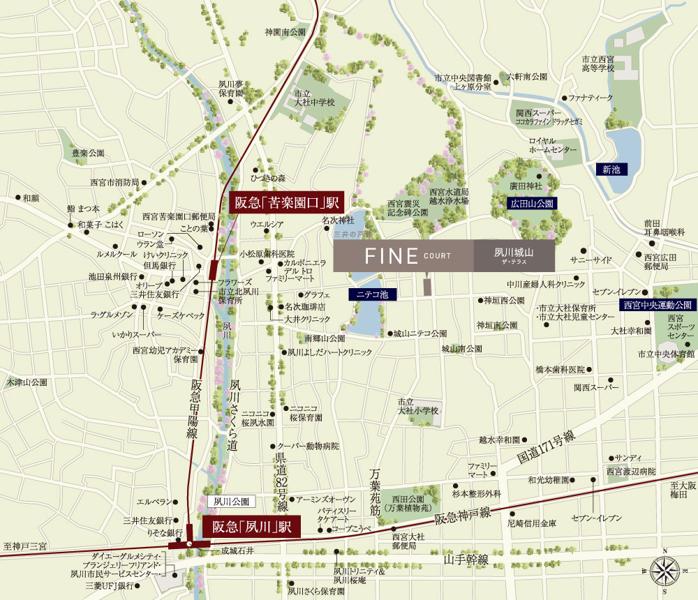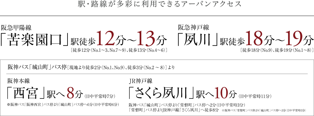 東海道本線「さくら夙川」駅 バス10分 バス停から徒歩2分~3分 現地より「城山町」バス停まで徒歩2~3分、バス乗車時間2分、「常盤町」バス停から「さくら夙川」駅まで徒歩8分 - 総戸数