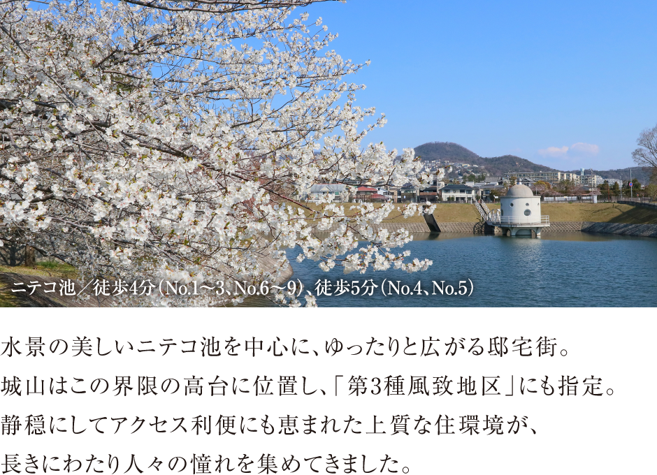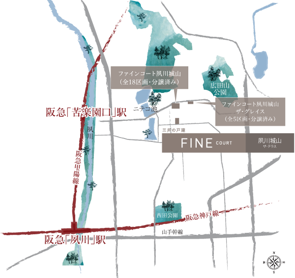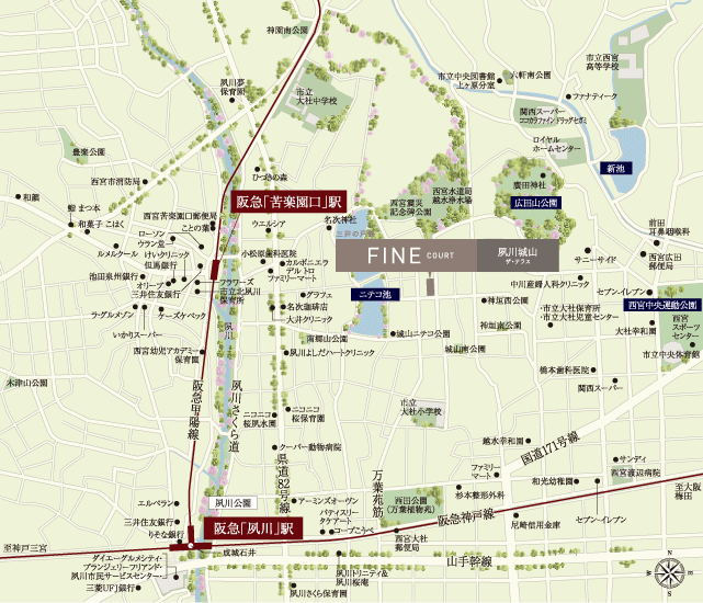 東海道本線「さくら夙川」駅 バス10分 バス停から徒歩2分~3分 現地より「城山町」バス停まで徒歩2~3分、バス乗車時間2分、「常盤町」バス停から「さくら夙川」駅まで徒歩8分 - 総戸数