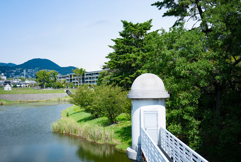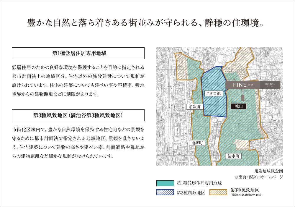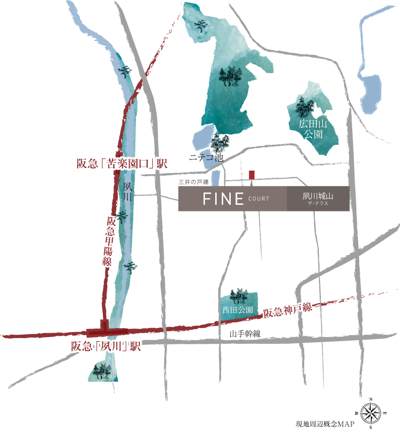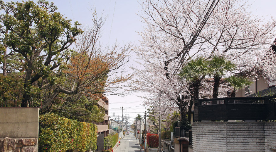 夙川やニテコ池の景観を引き継ぐように、桜や緑に彩られる城山の街並み。六甲の山並みを背景に穏やかな住環境が広がっています。