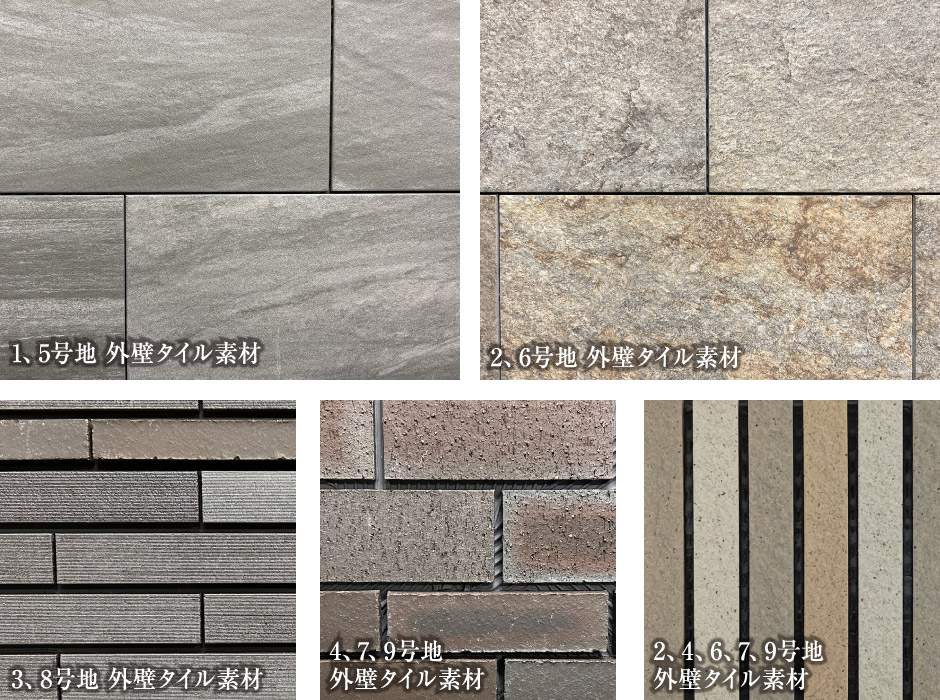 自然石の風合いが息づく「外壁タイル」を選定。各邸によって異なる色柄のものを数種合わせ、貼り分けることで、歳月を経て味わいを深める佇まいとしています。また、計画地にあった石積み擁壁から想起し、石目調のタイルを基壇部に採用。重厚な礎の上に一邸一邸が個性を描きつつ、街区としての存在感を主張します。