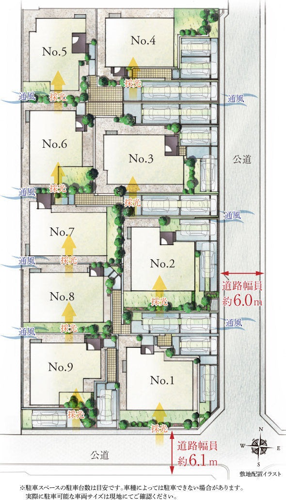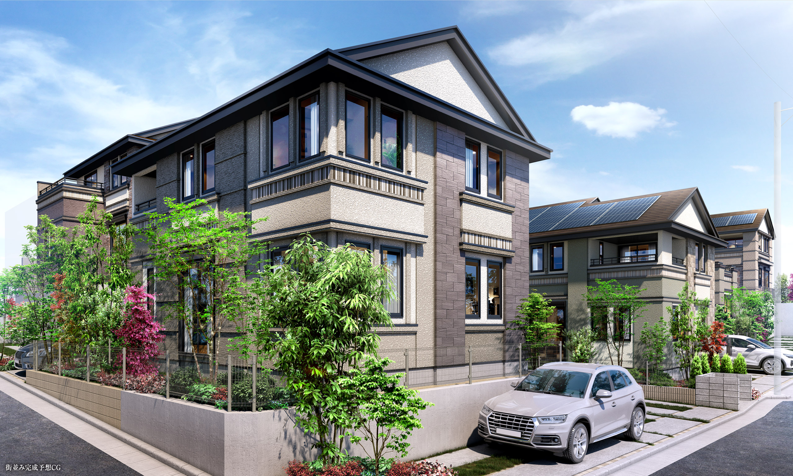 ※掲載の街並み完成予想CGは設計図を基に作成したもので、形状・色等は実際とは異なります。外観形状の細部・設備機器等は表現しておりません。表現されている植栽は竣工から初期の育成期間を経た状態のものを想定して描いております。竣工時は植物の生育を見込んで必要な間隔をとって植えております。家具・調度品等は販売価格に含まれません。予めご了承ください。※掲載の敷地配置イラストは、計画段階の設計図と現地周辺航空写真を基に描き起こしたもので、実際とは異なります。※掲載の立面イラストは計画段階の図面を基に描き起こしたもので実際とは多少異なります。※照明機器の種類や設置場所は変更になる場合があります。あらかじめご了承ください。