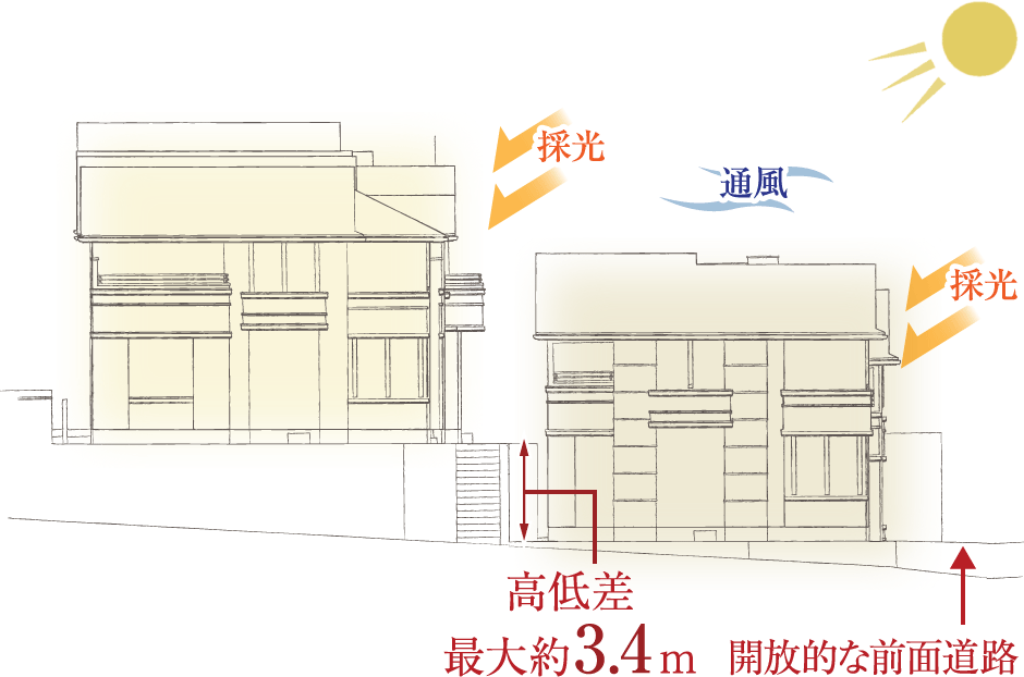 南面傾斜の高低差ある立地を活かして各区画を階段状に整地し、陽当たりや風通し、眺望に優れた住まいを実現。隣棟と視線が重なりにくく、プライバシー性も高めます。