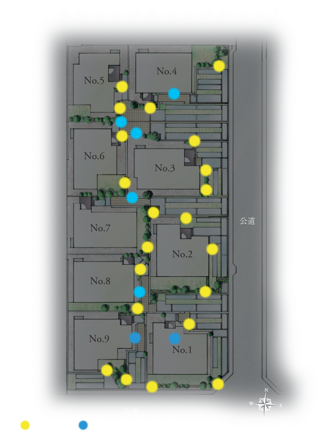 各邸の中・高木の植栽にアイキャッチとなるライティングを計画。