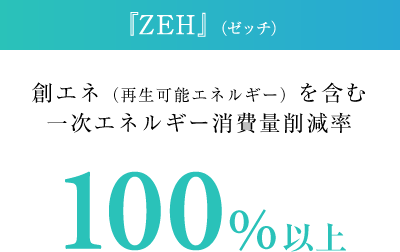 サッシや天井等の「高断熱」化、LED照明などの高効率設備による「省エネ」、太陽光発電による「創エネ」により、1年間の住宅の一次エネルギー消費量を100%以上(『ZEH』)削減することを目指した住宅です。