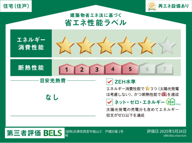 本物件は「BELS」における住宅の『ZEH』評価を取得しています。