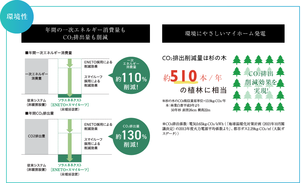 ■使用機器【従来システム(床暖設置)】/ガス給湯暖房機、ガス温水床暖房(LD)、ミストサウナ機能付きガス温水浴室暖房乾燥機、ガスコンロ、電気エアコン、大阪ガスのインターネット、ガス機器保証サービス等【ソラエネネクスト】/エネファームtype S、ガス温水床暖房(LD)、ミストサウナ機能付きガス温水浴室暖房乾燥機、ガスコンロ、電気エアコン、大阪ガスのインターネット、太陽光発電6.5kW■エネルギー使用量【従来システム(床暖設置)】【ソラエネネクスト】/年間ガス使用量:917㎥/年、年間購入電力量:5,400kWh/年、年間ガス使用量:1,630㎥/年、年間購入電力量:837kWh/年、太陽光発電自家消費量:363kWh/年■CO2排出係数/都市ガス:2.29kg-CO2/㎥(大阪ガスデータ)、ガソリン:2.322kg-CO2/L、電気:0.65kg-CO2/kWh(地球温暖化対策計画[2021年10月閣議決定]の2013年度火力電源平均係数より)■樹木のCO2吸収量/杉の木のCO2吸収量原単位=13.9kg-CO2/年・本(林業白書平成9年より50年杉直径26cm樹高22m)※一次エネルギー換算値は、ガス:45MJ/㎥、電気:9.76MJ/kWh