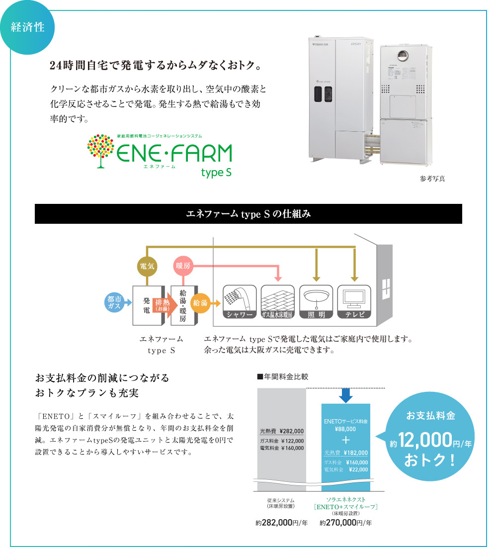 【従来システム(床暖設置)】/ガス給湯暖房機、ガス温水床暖房(LD)、ミストサウナ機能付きガス温水浴室暖房乾燥機、ガスコンロ、電気エアコン、大阪ガスのインターネット、ガス機器保証サービス等【ソラエネネクスト未採用時】/ガス給湯暖房機、ガス温水床暖房(LD)、ミストサウナ機能付きガス温水浴室暖房乾燥機、ガスコンロ、電気エアコン、大阪ガスのインターネット、ガス機器保証サービス等、太陽光発電6.5kW【ソラエネネクスト】エネファームtype S、ガス温水床暖房(LD)、ミストサウナ機能付きガス温水浴室暖房乾燥機、ガスコンロ、電気エアコン、大阪ガスのインターネット、太陽光発電6.5kW■エネルギー使用量と適用料金【従来システム(床暖設置)】/年間ガス使用量:917㎥/年(適用ガス料金:あっためトク料金スタンダードプランオプション割引9%)、年間購入電力量:5,400kWh/年(適用電気料金:従量電灯A)合計ランニングコスト:約282,000円/年【ソラエネネクスト未採用時】/年間ガス使用量:917㎥/年(適用ガス料金:あっためトク料金スタンダードプランオプション割引9%)、年間購入電力量:5,038kWh/年(適用電気料金:従量電灯A)、太陽光発電自家消費量:363kWh/年、合計ランニングコスト:約270,000円/年【ソラエネネクスト】年間ガス使用量:1,630㎥/年(適用ガス料金:スマート発電料金オプション割引9%)、年間購入電力量: 837kWh/年(適用電気料金:家庭用ガス発電プラン)、太陽光発電自家消費量:363kWh/年、合計ランニングコスト:約182,000円/年、ENETOサービス料金: 88,000円[ソラエネネクスト未採用時の合計ランニングコスト(約270,000円/年)との差額]