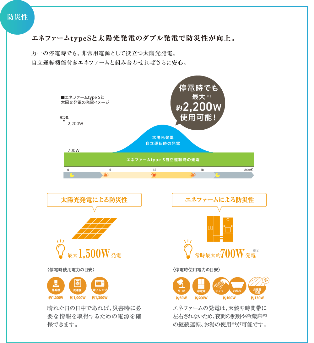 ※2.自立運転時の発電出力は、お客さまがお使いの機器の電力量によって変化します。バックアップ熱源機が動作するのに必要な電力量も含みます。エネファームtype Sが発電していない時に停電になった場合は、停電時自立発電に切り替わりません。