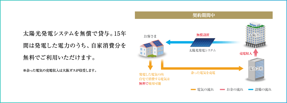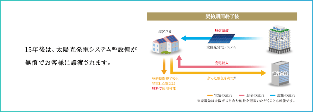 ※2.ソラエネネクストの契約期間中(15年間)は、太陽光で発電した電気の内、自宅で消費する電気は無償で使用が可能です。余剰電力の売電収入は大阪ガスに入ります。契約期間終了後は、太陽光発電システムはお客さまに無償譲渡されます。