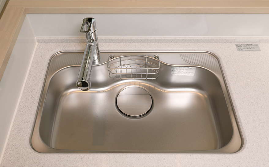 コンパクトながらも大きな鍋も洗える形状で水はね音を軽減する静音タイプのシンク。