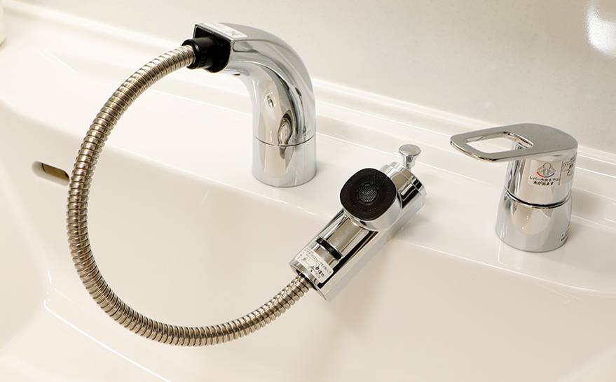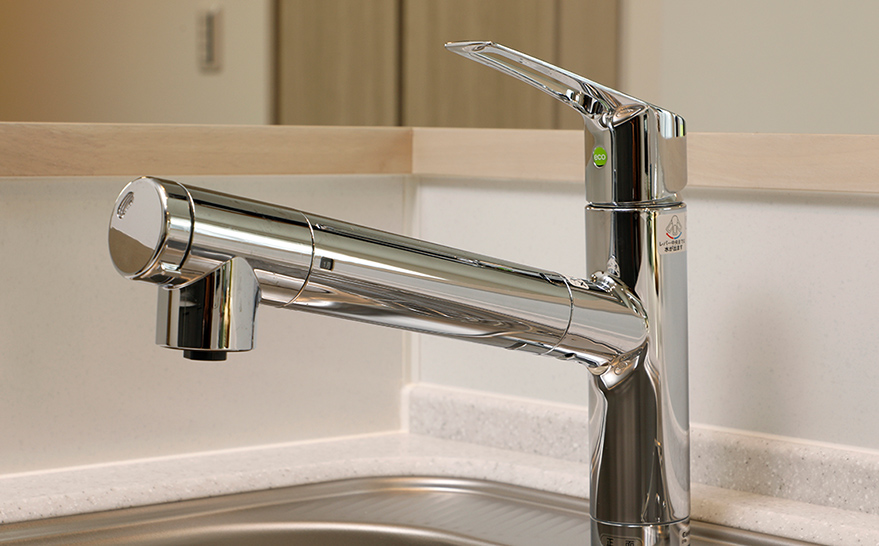 ノズルが引き出せ、浄水器を内蔵したシングルシャワー混合水栓を採用。※カートリッジの交換は有償となります。