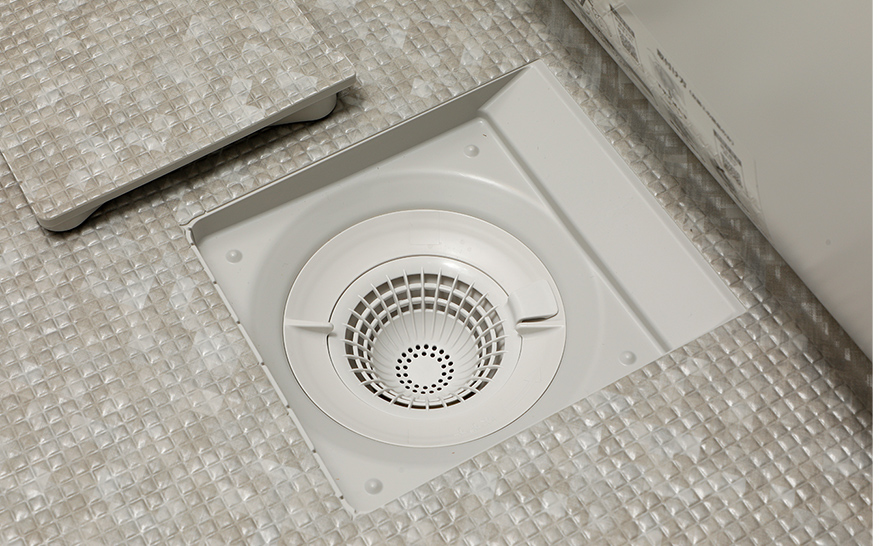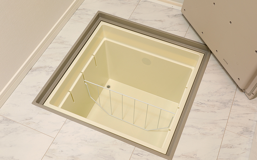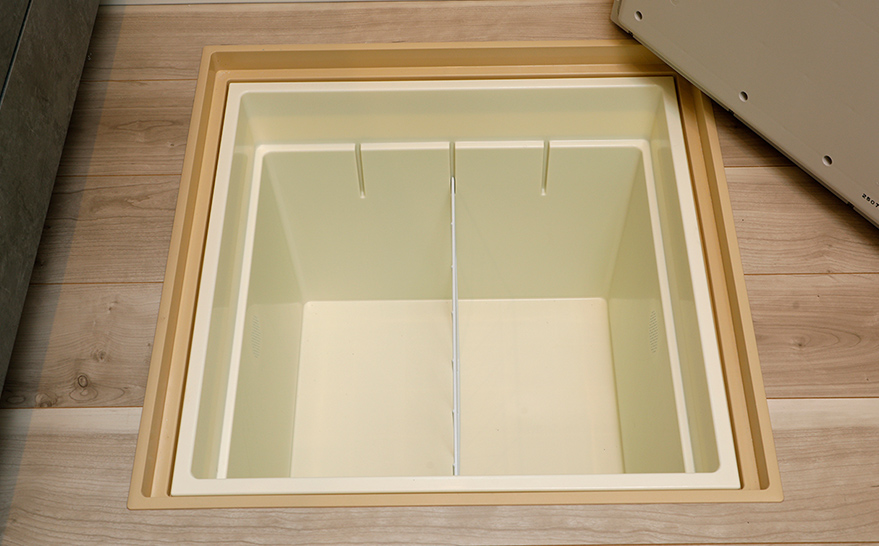 洗面用品や洗剤など日用品のストックに便利な床下収納を設置。