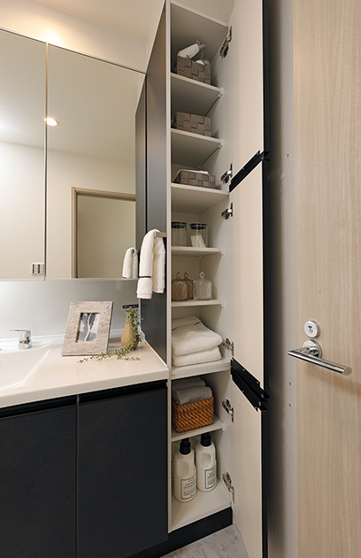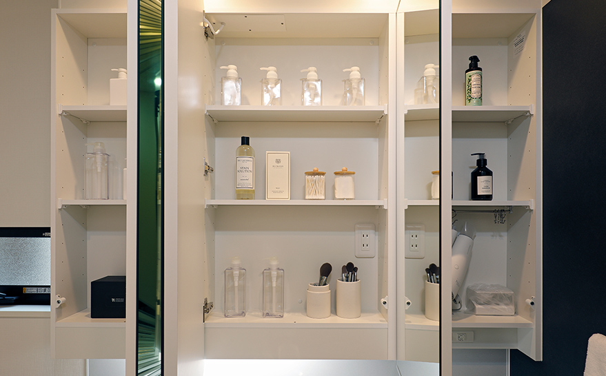 大型三面鏡の裏には洗面用具やコスメ用品をスッキリ整頓できる収納を設置。
