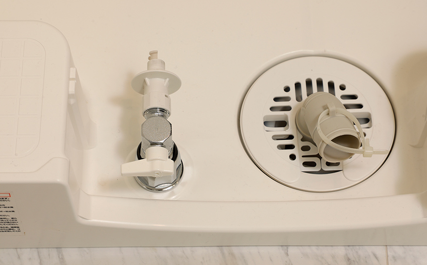ホールが外れると自動的に給水が止まる緊急止水弁付きの洗濯栓を採用。