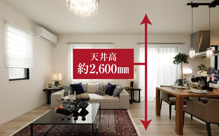 リビングダイニングは天井高を全邸約2,600mm。開放的で広々とした空間を実現。※一部下がり天井があります。