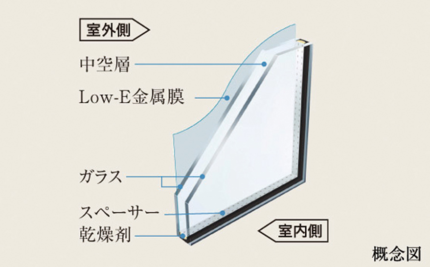 全ての窓にLow-E複層ガラスを採用。冷暖房効率を高める効果に期待。