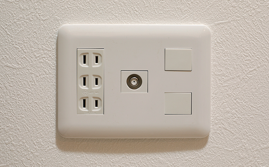 電源、TV端子(実線配線済み)、電話、インターネット回線(空配管対応)をスッキリ1つにまとめた便利なコンセント。