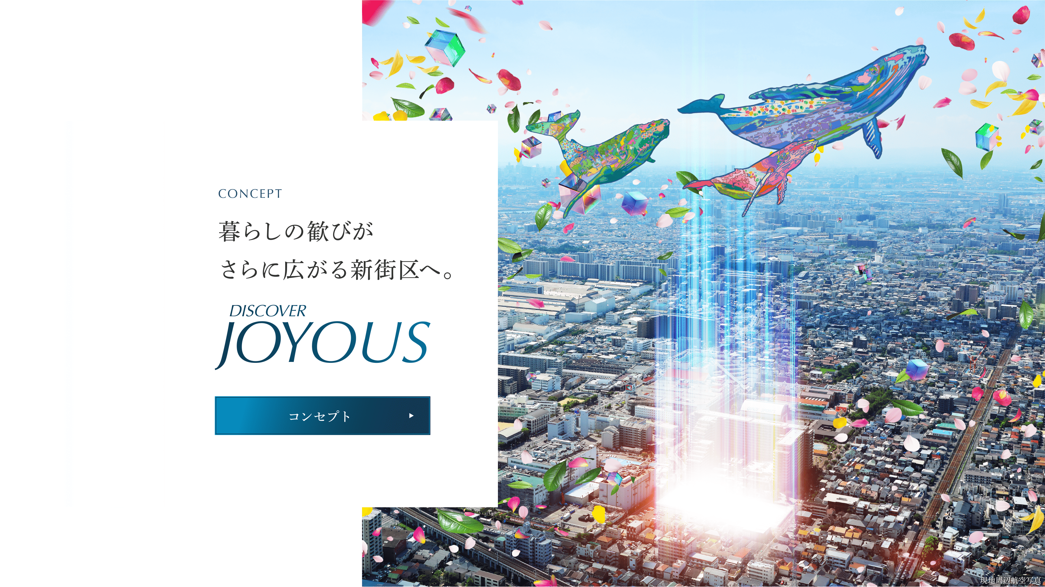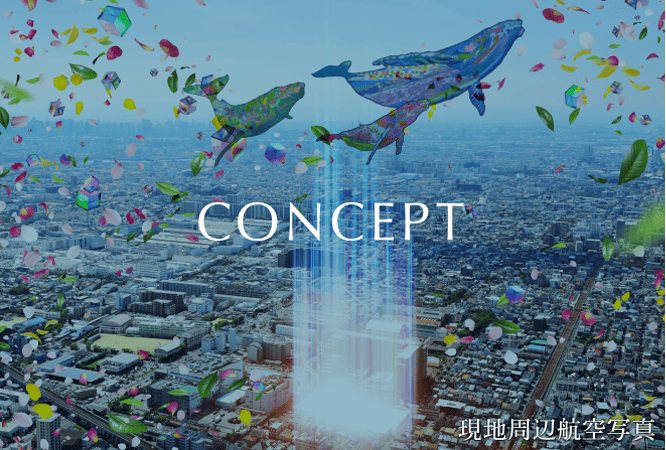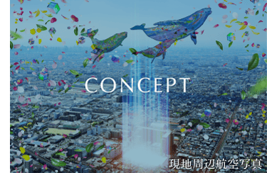 ※掲載の3頭のくじらイラストは、本プロジェクトの広大な敷地・開発規模をモチーフとして表現したものです。また、くじらのシルエット内に描いたカラフルな図形・風景は、本プロジェクトの世界観を表現しているもので実際とは異なります。