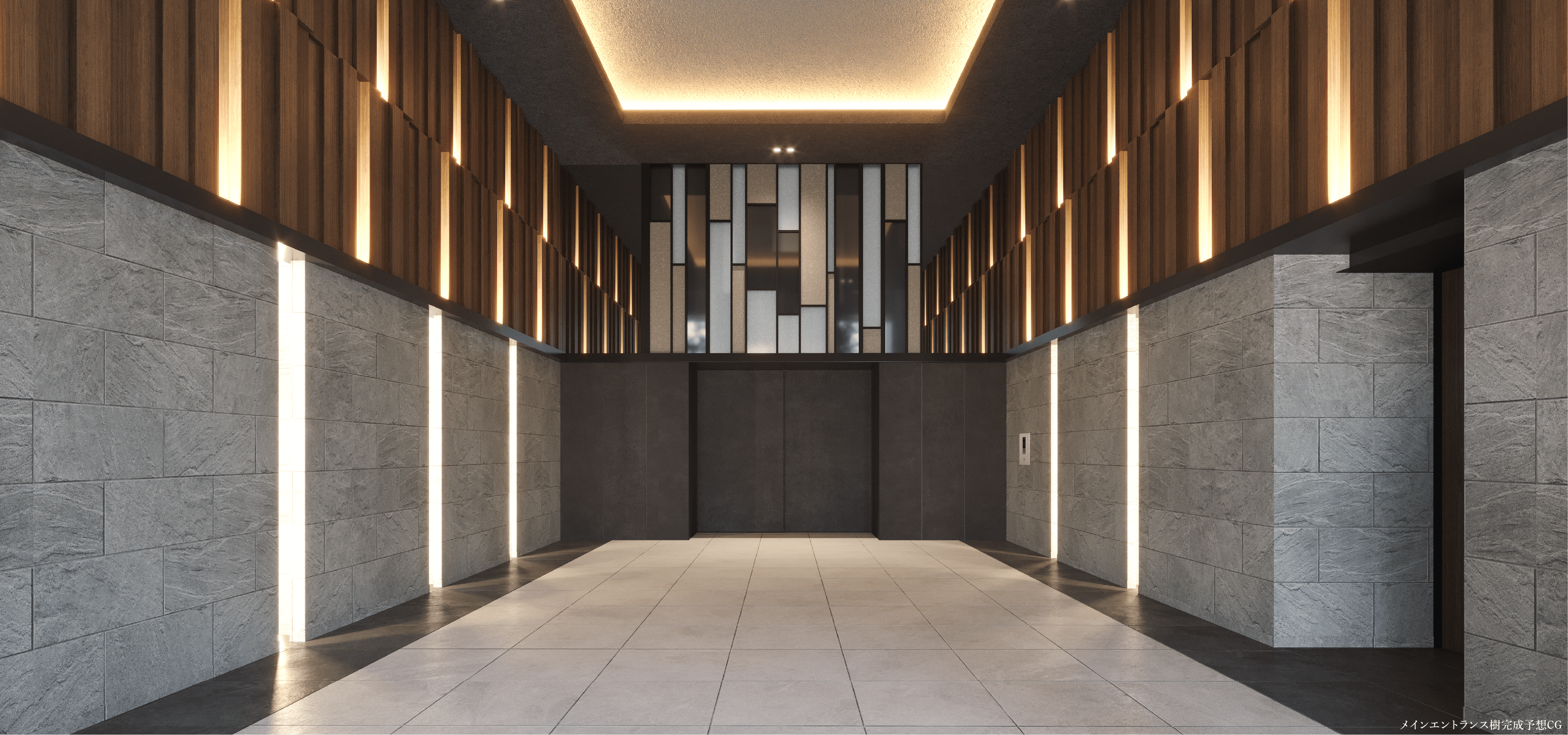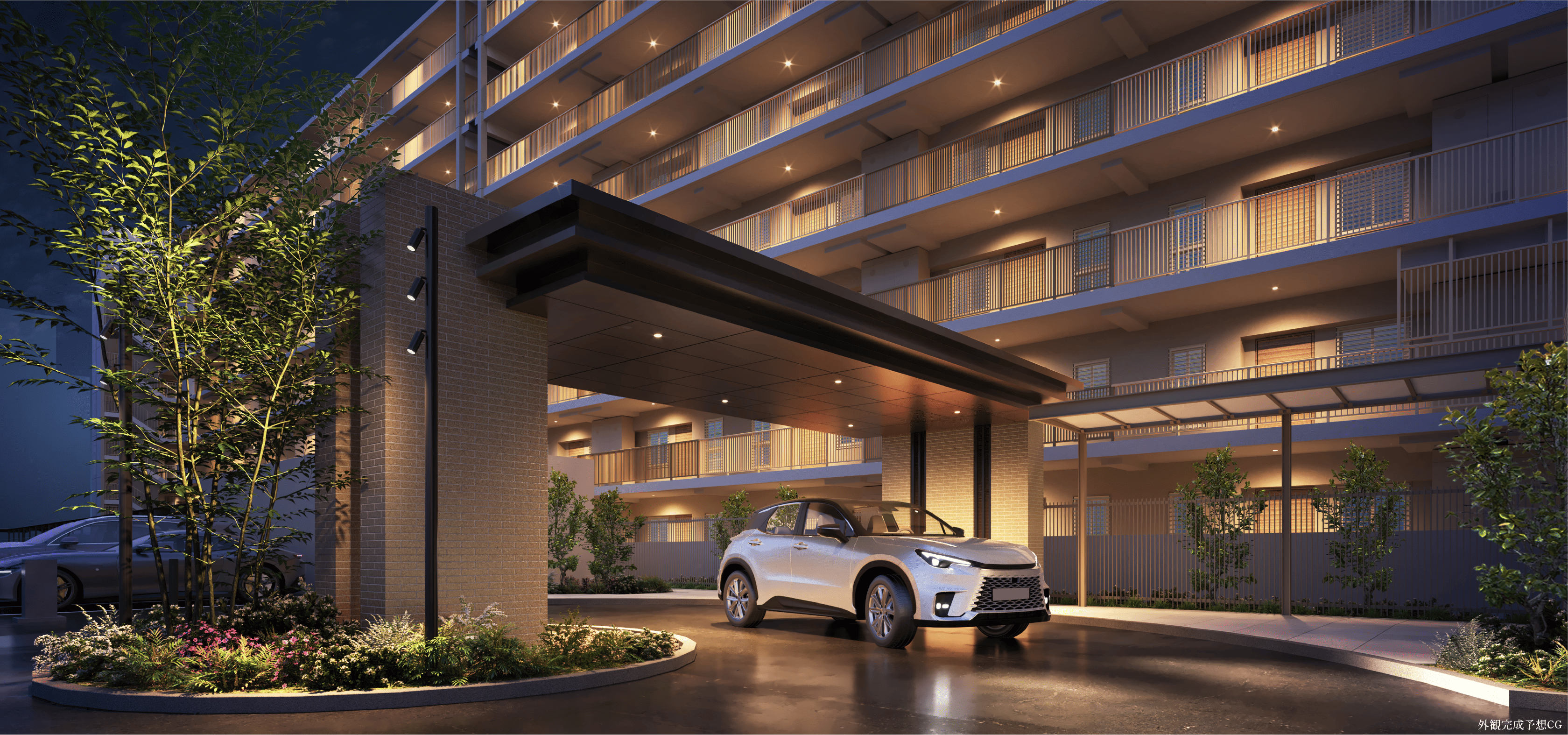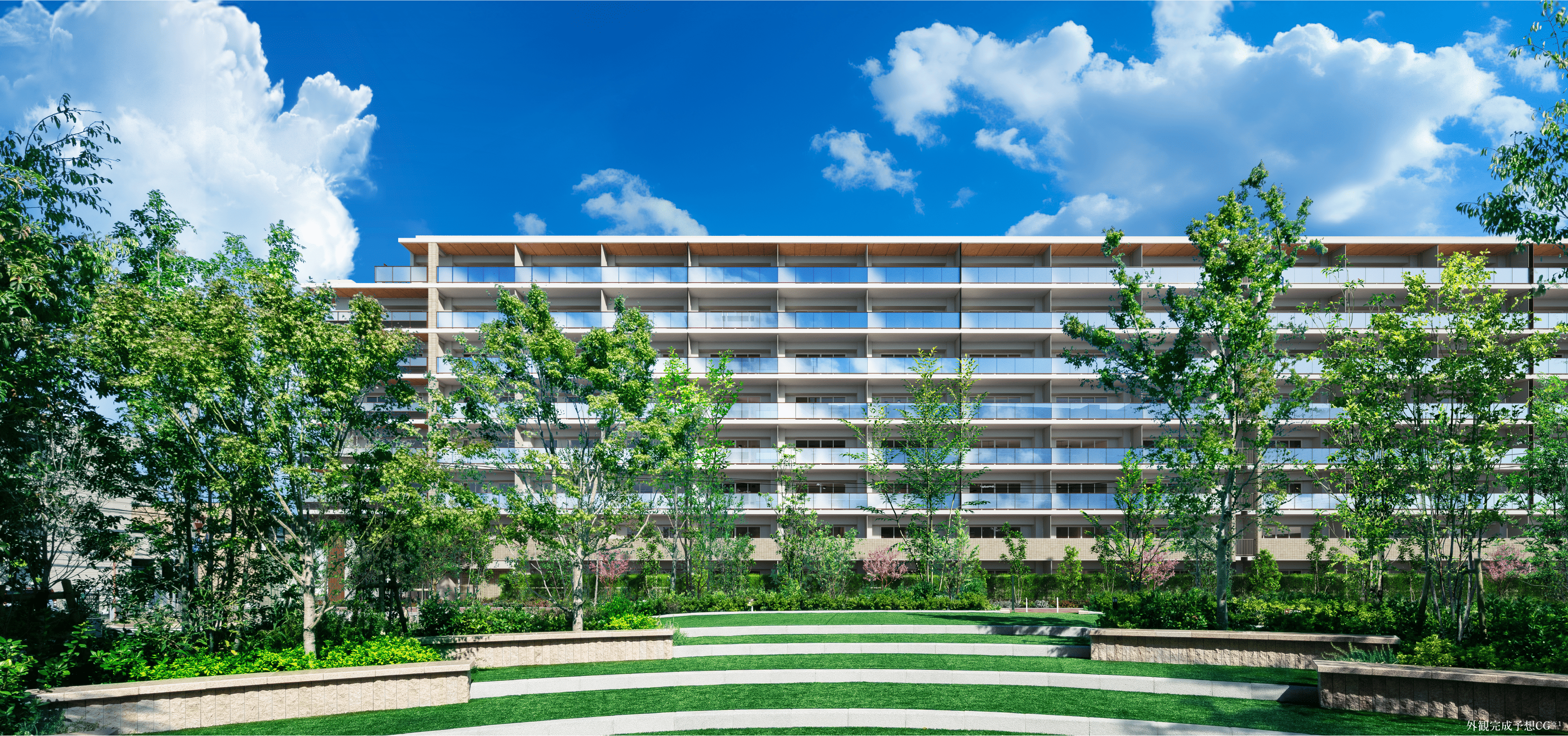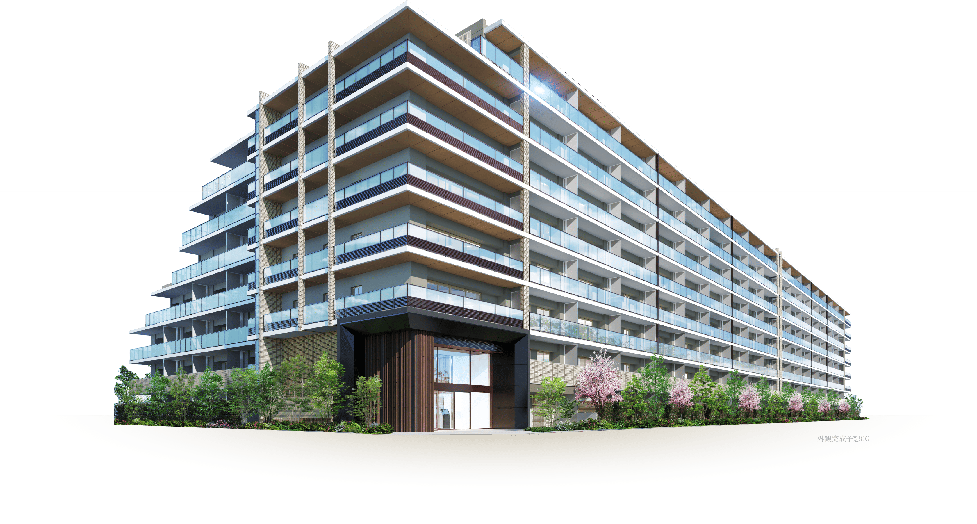 ※掲載の各外観完成予想CGは、計画段階の図面を基に描き起こしたもので形状・色等は実際とは異なります。施工上の都合、行政官庁の指導などにより変更が生じる場合があります。なお、外観形状の細部、設備機器等は表現しておりません。敷地内植栽は竣工から初期の生育期間を経た状態のものを想定して描いており、竣工時は植物の生育を見込んで必要な間隔をとって植えております。植栽は計画段階のもので、変更となる場合があります。