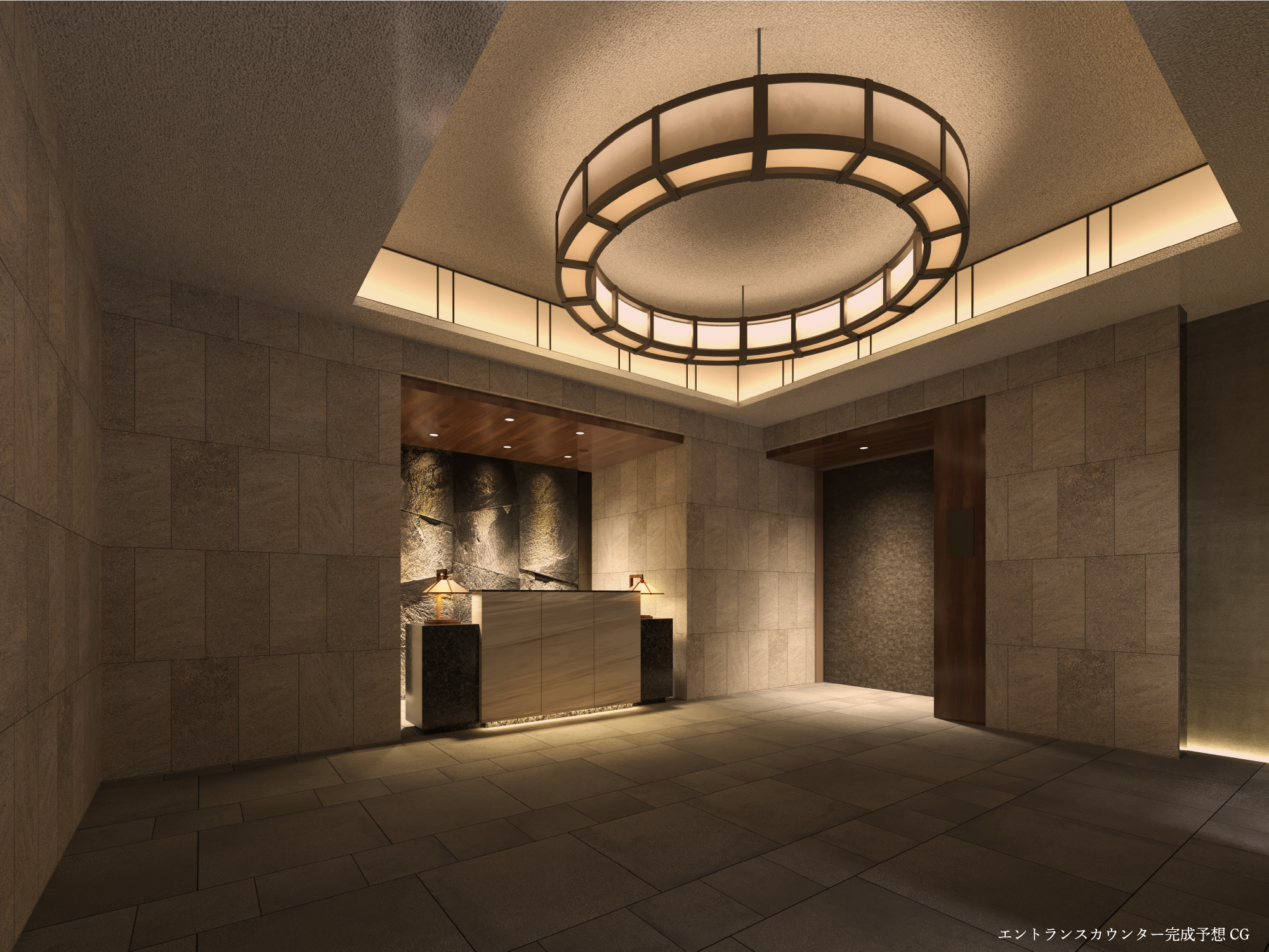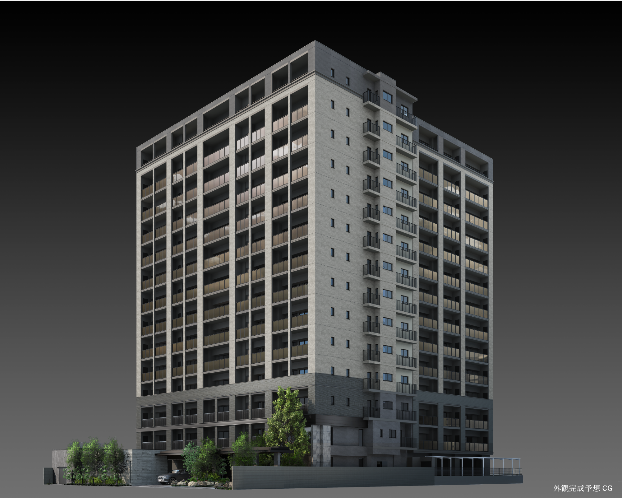 ※掲載の外観完成予想CG・エントランス外観完成予想CG、エントランスホール完成予想CG、ラウンジ完成予想CGは計画段階の図面を基に描き起こしたもので、形状・色等は実際とは異なります。外観完成予想CGは敷地内のみを表現しております。なお、形状の細部、設備機器等は表現しておりません。表現されている植栽は竣工から初期の育成期間を経た状態のものを想定して描いております。竣工時は植物の生育を見込んで必要な間隔をとって植えております。施工上の都合により、設定位置・植高・本数等変更となる場合があります。周辺の道路・建物などについては一部簡略化しており、実際とは異なります。
