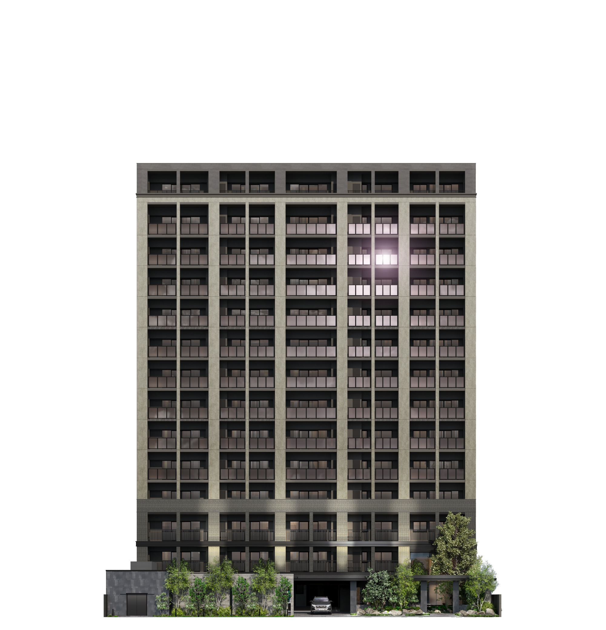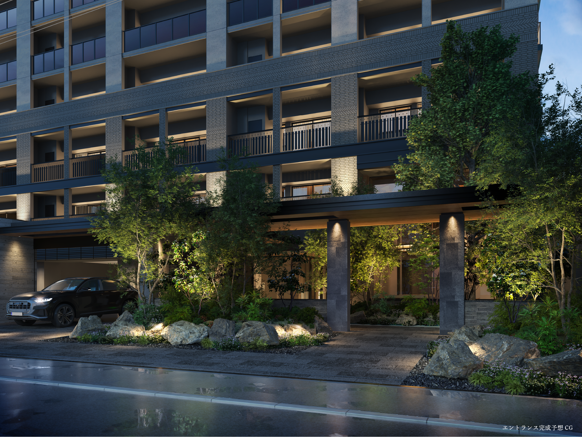 都心でありながら、緑に抱かれる静かなアプローチ。 低層部の緑と石張りのマテリアルが、 建築の重厚さを柔らかくし、 居住者や訪問者を迎える優雅な迎賓空間を形成しています。