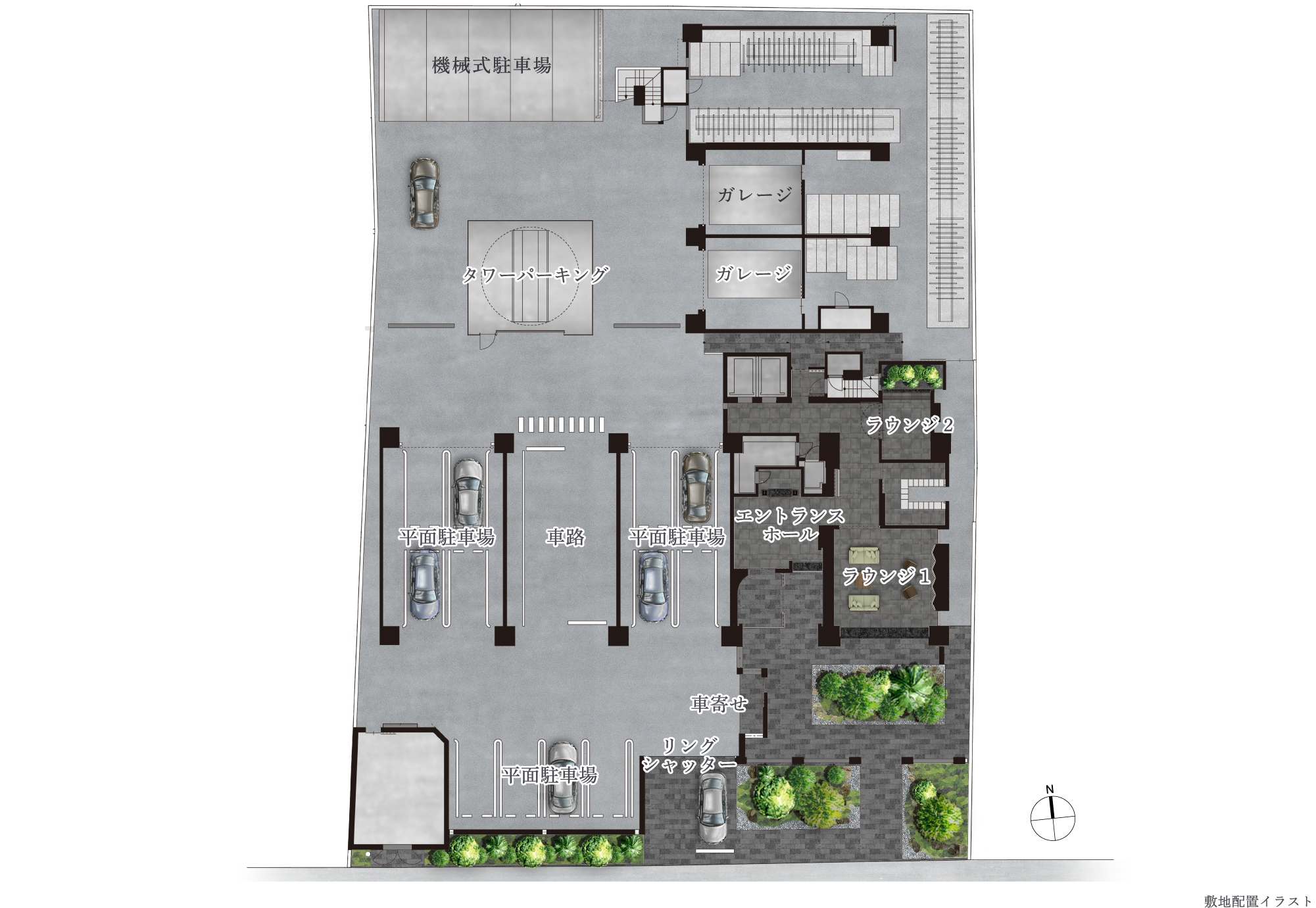 ※掲載の敷地配置イラストは、計画段階の図面を基に描き起こしたもので、形状・色等は実際とは異なります。なお、外観形状の細部・設備機器等につきましては表現しておりません。